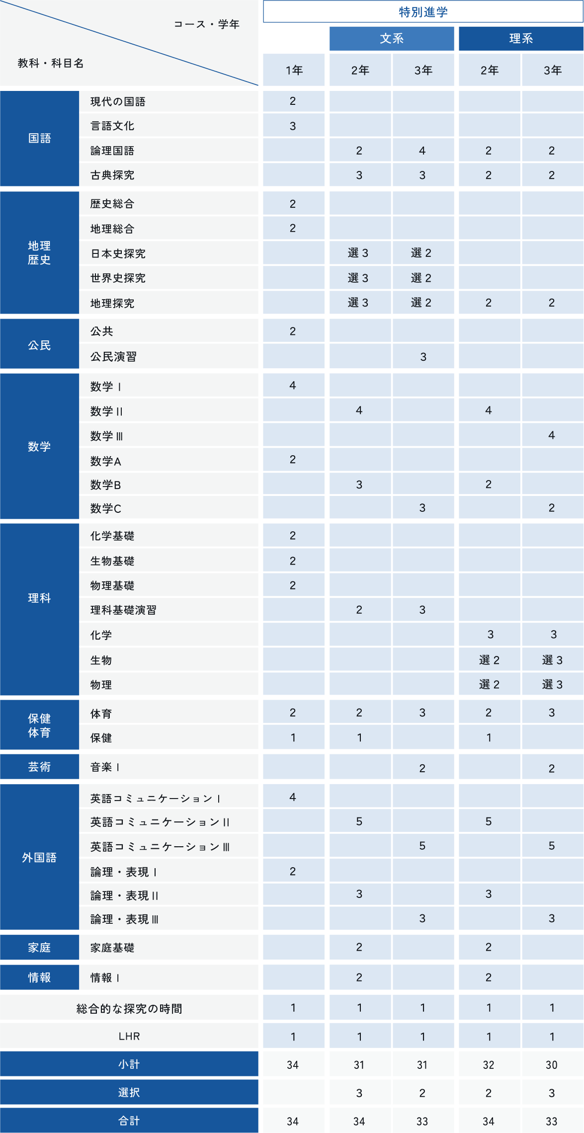 ※特進文系は2年より地理歴史選択、「日本史探究」「世界史探究」「地理探究」より1科目選択
