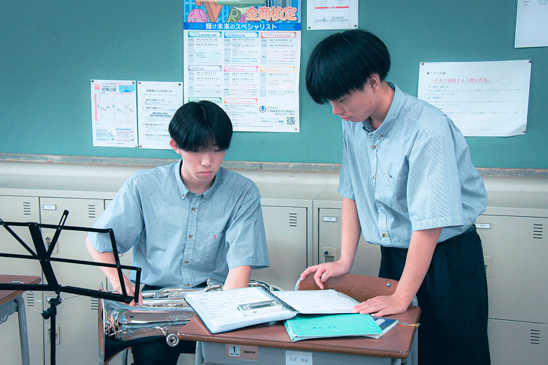中国大会金賞を目標に練習に励んでいます。コンクールの他にも、文化祭や野球応援、演奏会や依頼演奏などがあります。学年関係なく仲が良く、貴重な経験ができ、大きく成長できる部活動です。私たちと一緒に楽しみながら吹奏楽をしませんか?