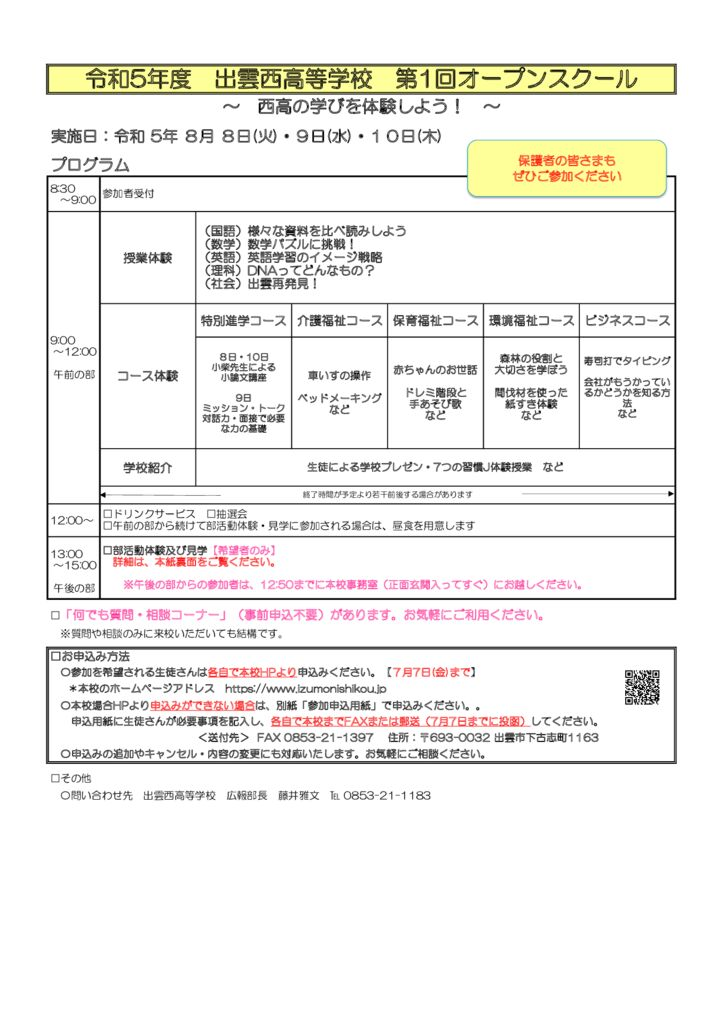 なお、台風接近に伴いJRが10日西出雲駅より西の運転を見合わせるとの告知をされていますので、JRを利用されてのご参加は難しいと思われます。そのことにより参加が難しい方は本校(0853-21-1183)までご連絡をお願いします。10月1日(9月1日より申込受付開始)と11月3日にもオープンスクールを開催しますので、ぜひともご参加ください。