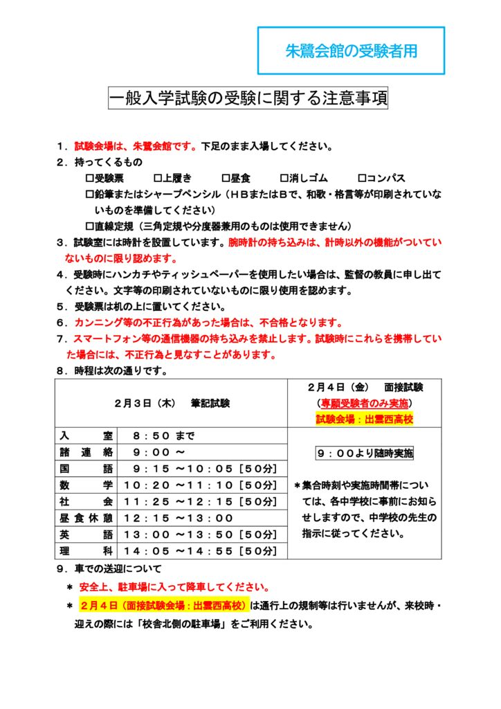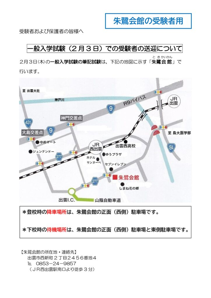 一般入学試験(2月3日)を「朱鷺会館」で受験される生徒・保護者の皆様へ