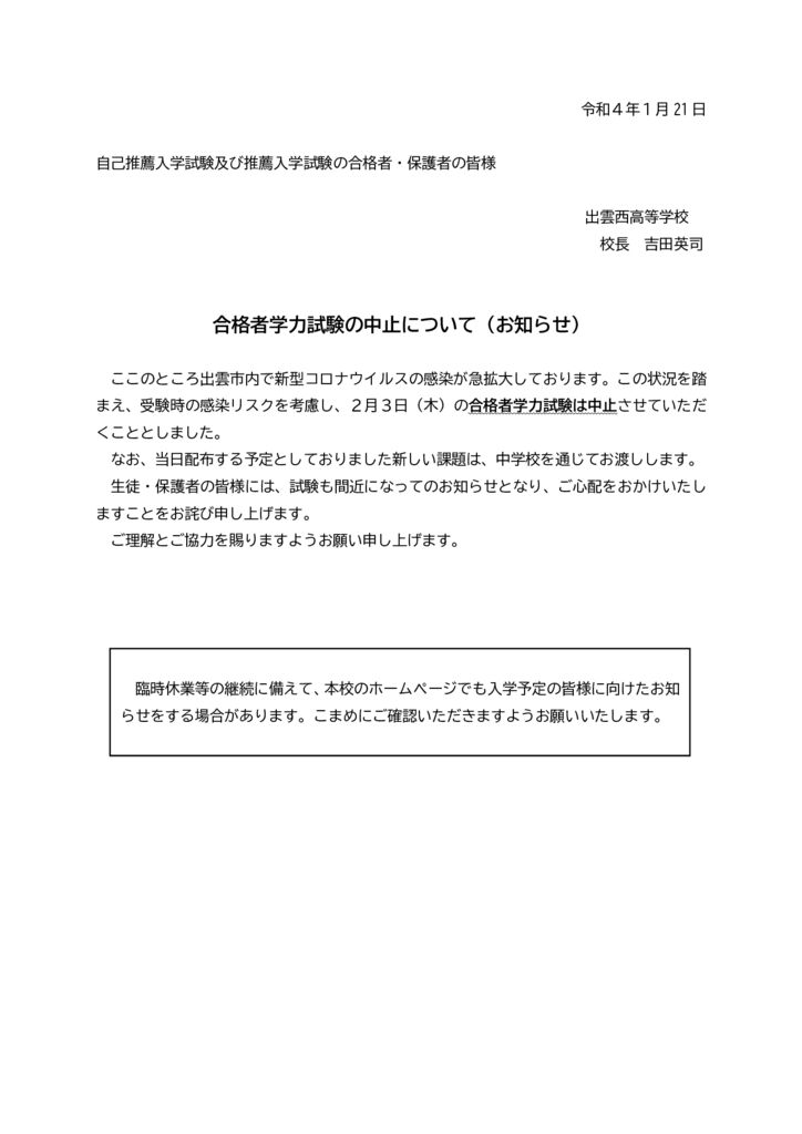 令和4年度入学生合格者学力試験の中止についてのお知らせ