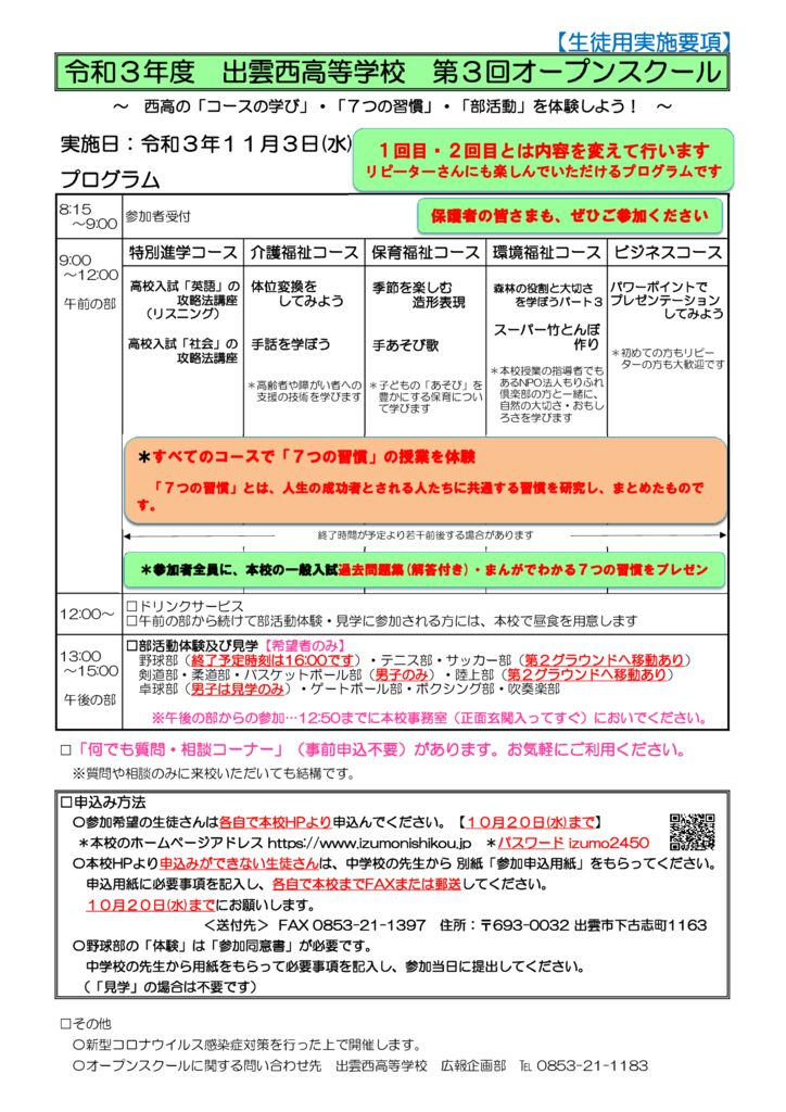 〇オープンスクールに関するお問い合わせは、出雲西高等学校 広報企画部 TEL 0853-21-1183 までお願いいたします。