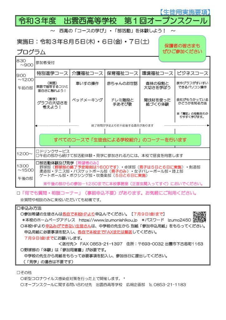 〇オープンスクールに関するお問い合わせは、出雲西高等学校 広報企画部 TEL 0853-21-1183 までお願いいたします。