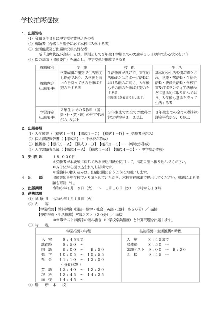 合格者は全員、一般入選抜を学力試験として受験していただきます。その結果が優秀であれば、特待制度が適用されたり、特待条件がさらに良い条件となる場合があります。ただし、新型コロナウイルス感染症の感染拡大状況によっては学力試験を延期または中止することがあります。また、試験の点数によってはコースの変更を打診させていただくこともありますが、変更を強要するものではありません。